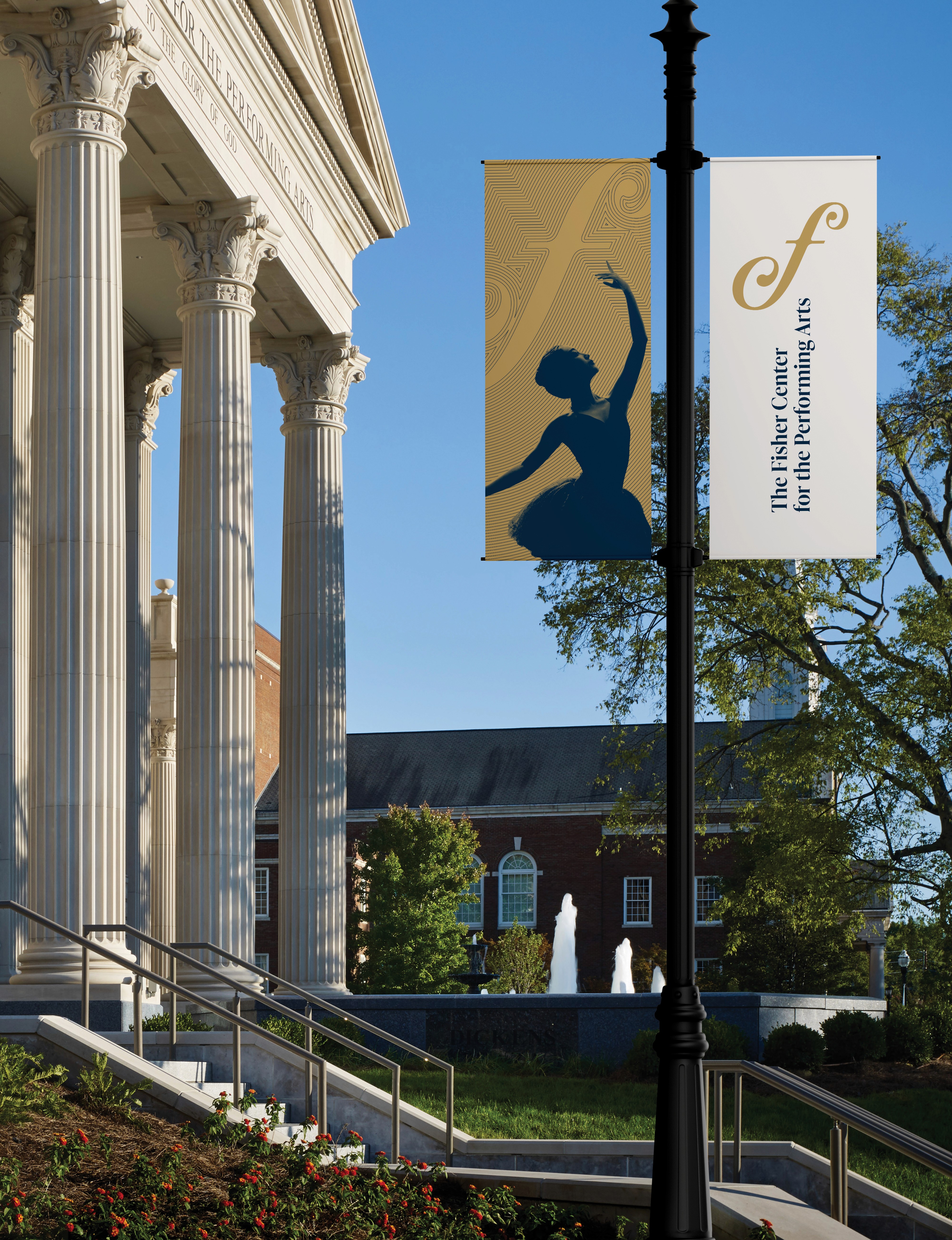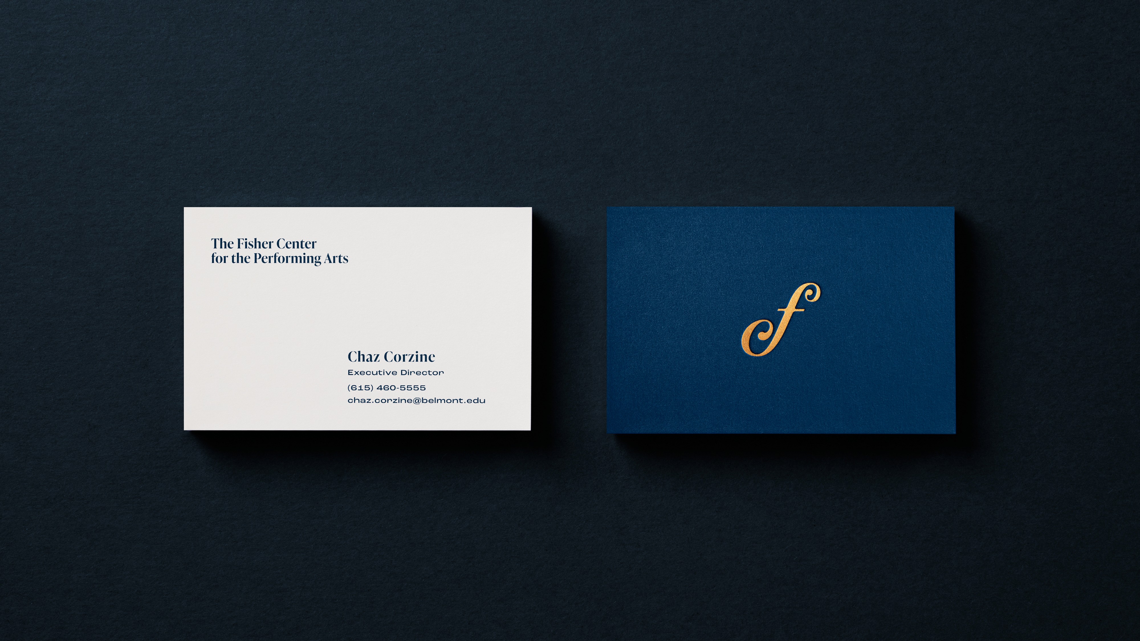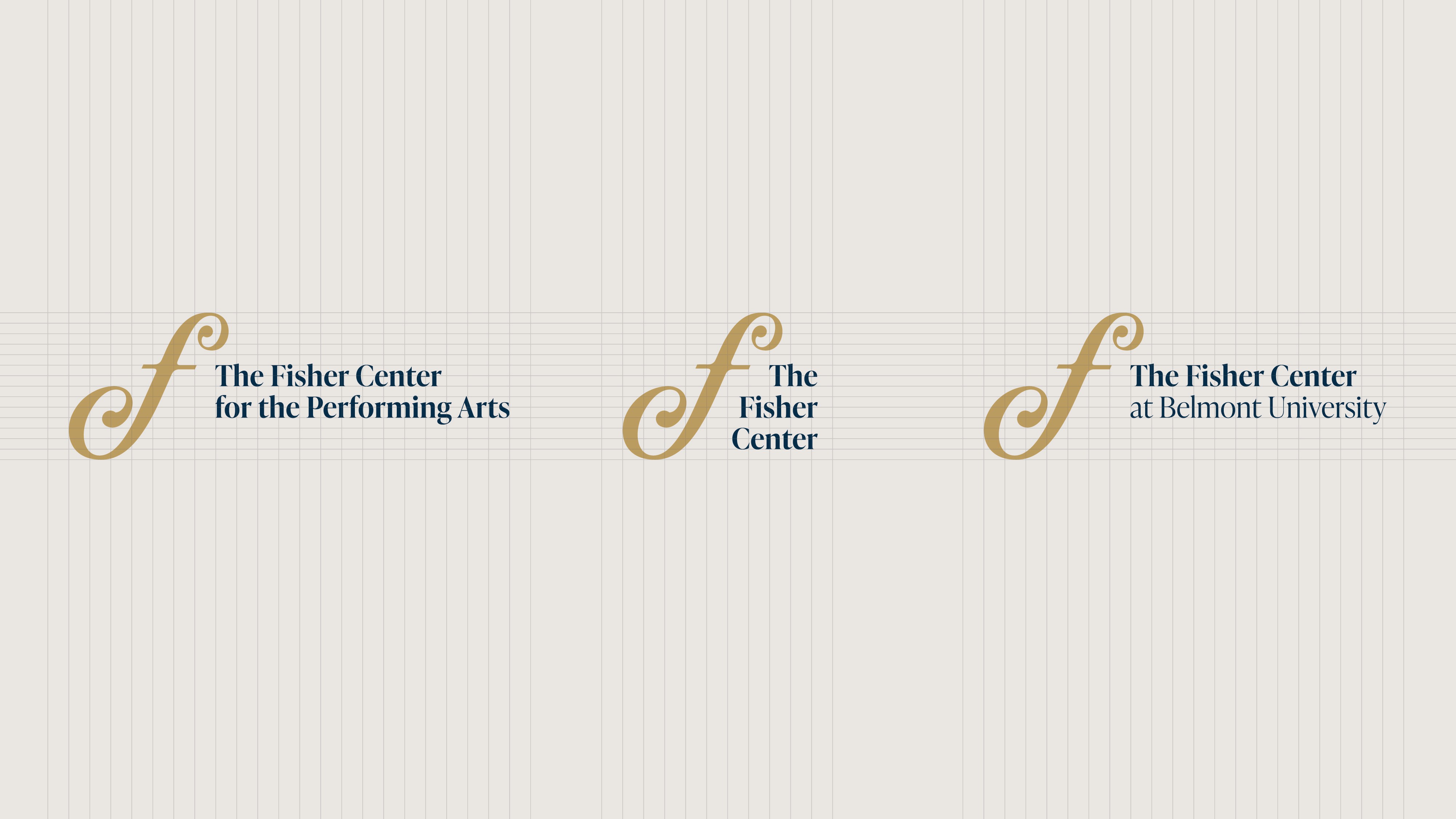 Located at the heart of Belmont University’s campus, the Fisher Center is an artistic catalyst for engagement, inspiration, and discovery. The 150,000 sq. ft. center contains a 1,727-seat European style performance hall, two multipurpose ballrooms, rehearsal space, dressing rooms, and impressive technical facilities. The iconic F lettermark draws upon inspiration from a host of musical and architectural details. At a glance, the lettermark resembles the forte symbol used in Western music notation to indicate where a particular passage is to be performed loudly and with strength. It also draws upon the unique architectural elements that adorn the majestic Fisher Center. Lastly, the accentuated angles of the lettermark draws inspiration from the graceful movement of classical ballet dancers. With these elements carefully crafted and blended together, the brand identity embodies the bold, sophisticated, and grandiose vision of the Fisher Center.
